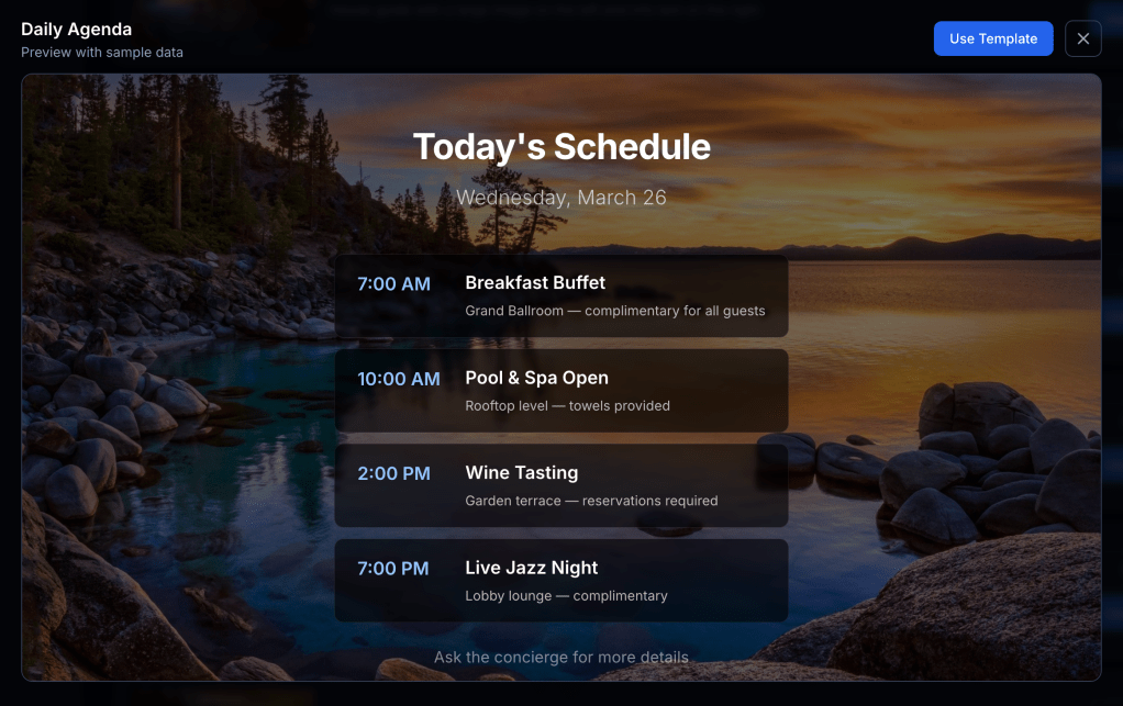 Daily Agenda supports up to four time-slotted items. Useful for properties that run activities or have scheduled amenities.