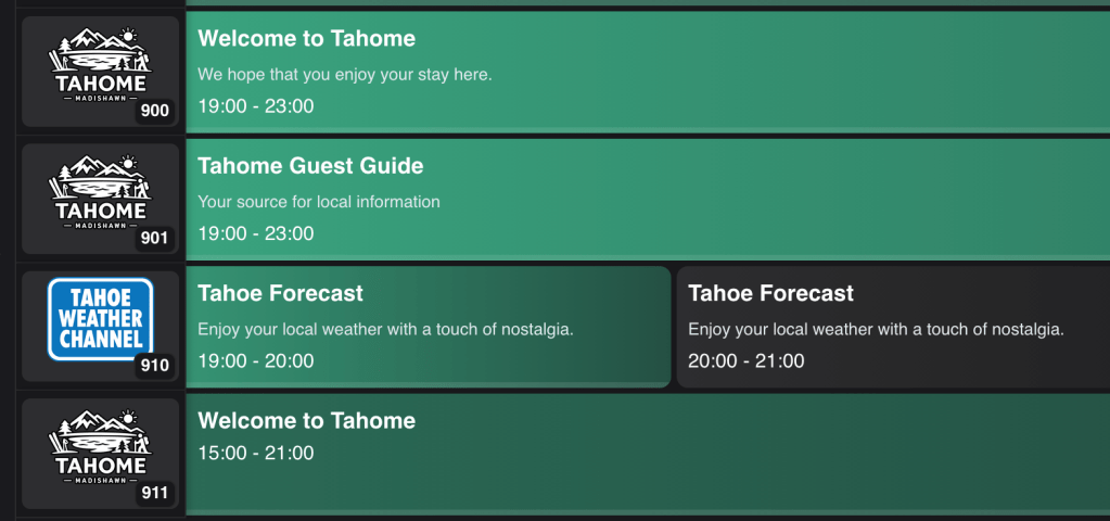 The result is that a guest turns on the TV and sees a channel. Not an app launcher, not a login screen. Just a channel playing a welcome reel with their name, the house rules, and local recommendations, all looping with background music. It feels like a hotel experience, which is exactly the point.